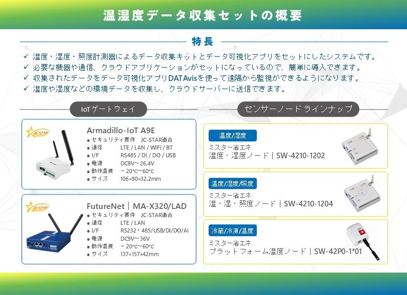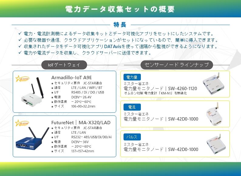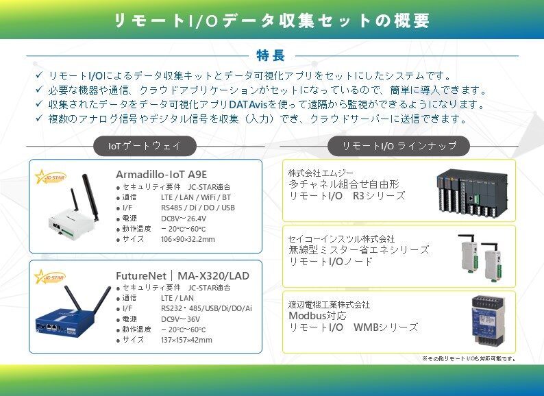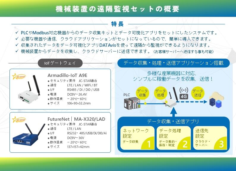 本ソリューションは、設備や機械装置からのデータ収集キットとデータを遠隔から可視化できるクラウドアプリケーションを セットにしたパッケージソリューションとなります。現場の環境に合わせて組み合わせて活用する事も可能です。